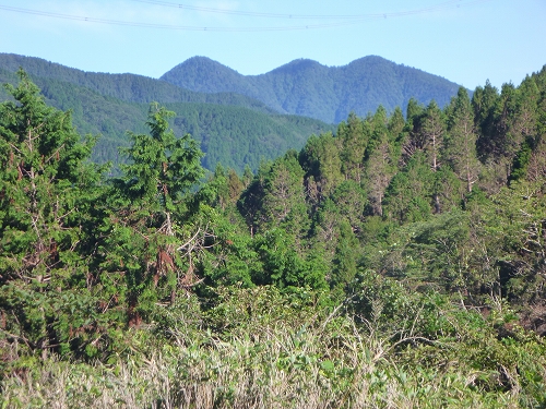 ヤビツ峠バス停から歩き始めます 今日も大山三峰がきれいに見えています 快晴です でも暑そうです