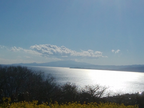 海がキラキラ輝いています 雲がかかった天城山やその左に大室山も見えます