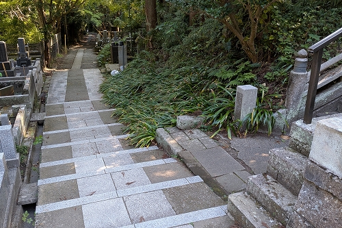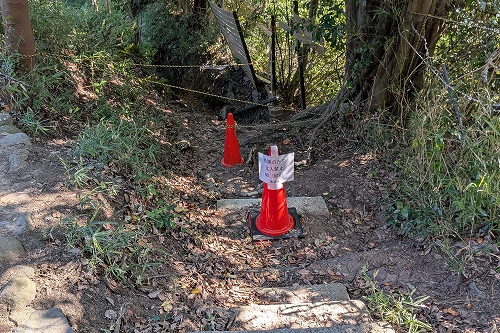 下りきる直前が通行止めでした 左側に墓地内を迂回します