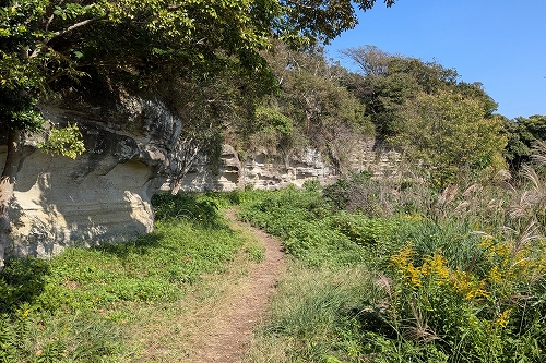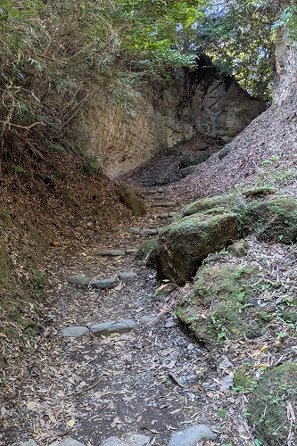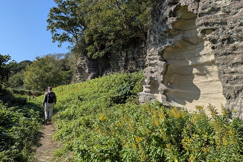 尾根道へは行かず「お猿畠の大切岸(おおきりぎし)」を見ながら歩きます 大切岸は石切場跡のことです