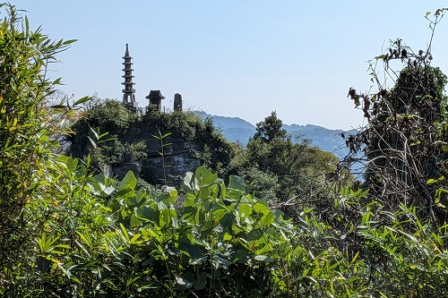展望広場から猿畠山法性寺(えんぱくざんほっしょうじ)の多層塔が見えました あの場所が猿畠山の山頂なのでしょうか?