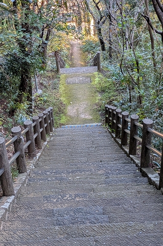 白山展望台を出て男坂を下ります 高低差のある階段が続くので足への負担が大きいです