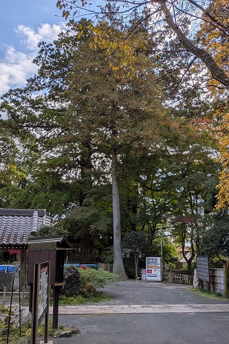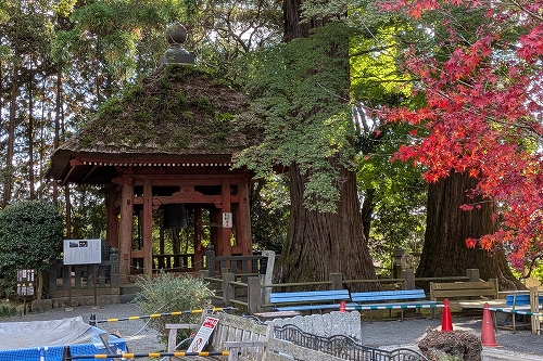 鐘堂の横の杉は、樹齢約850年といわれる天然記念物の二本杉です