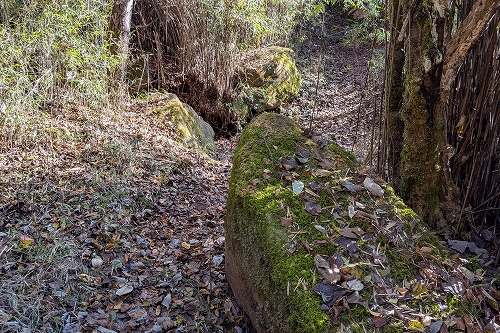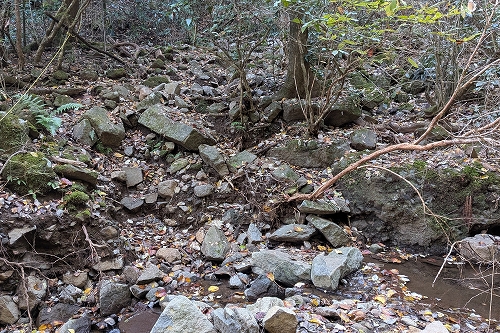 先ほどのショートカットの出口です 途中に源頼朝が逃げる途中で休息のため兜を脱いだ場所に「カブト石」という石があるそうです