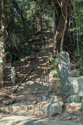 更に進むと社殿へ上る約340段の急な石段が待ち構えています 上がりきるまで一度立ち止まり息を整えました