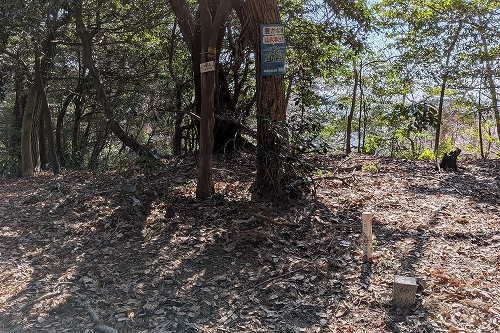踏み跡を進むと三角点がありました 木に八菅山の手書きプレートが貼ってありますが、名称を調べてみようと思います