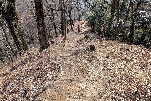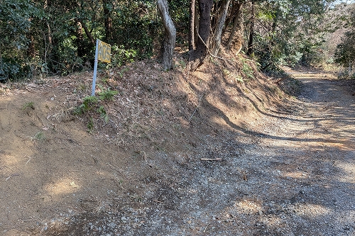 山道を登っていくと左側の高台へ上がる明確な踏み跡があったので、山頂への道だと思い、登りましたが誤りでした 戻って再び広い山道を登ります