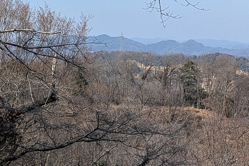 今日歩いてきた方面に目をやると、七尾山近くの高圧線鉄塔が見えました 食べ残しの中食を平らげてゆっくり休憩してから、鳶尾団地バス停へ下ります