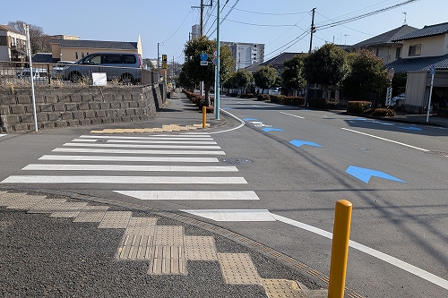 広い道路を左(東)方向へ歩いてバス停へ向かいます